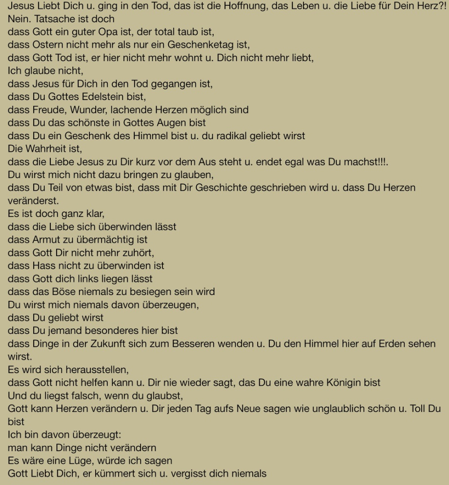 Glaubst Du es? Beginne Umzudenken, es nicht nicht so wie es scheint! Lies den steht von unten nach oben und entdecke die Wahrheit